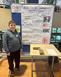 Das letzte Projekt in der Junior Sparte war das von Muhammed Yunus Colaker. Er trat im Fachbereich Chemie mit seinem Projekt zum selbst hergestellten Bioplastik an. Mit zahlreichen Untersuchungen und Variationen in seinem Rezept für das Bioplastik sowie der Untersuchung der Abbaumöglichkeiten konnte Yunus den zweiten Platz erreichen.