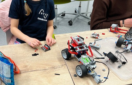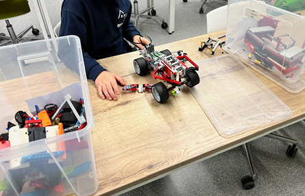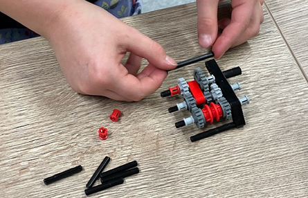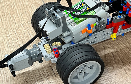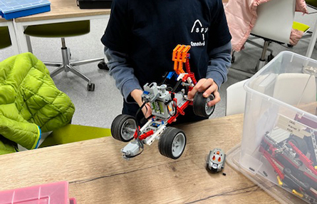 Im ersten Schulhalbjahr bauen die Kinder dazu Lego-Modelle und versehen diese mit verschiedenen Techniken der Fahrzeugkonstruktion. Spielerisch werden Achsen, Lenkungen oder Getriebe eingebaut. Die Fahrzeuge werden regelmäßig auf einem Parcours getestet, auf dem die Kinder die Zeiten ihrer Fahrzeuge per Stoppuhr selbstständig ermitteln können. Aktuell versucht ein Teil der Gruppe Schaltgetriebe in die Modelle einzubauen, um Geschwindigkeit bzw. Drehmoment vorab an die Bedingungen des Parcours anzupassen.