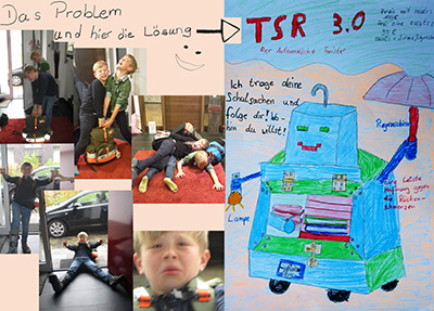"Deine Hoffnung gegen Rückenschmerzen!" Dein TSR 3.0 trägt alle deine Schulsachen und folgt dir automatisch wohin du willst. Mit Regenschirm, Sirene und Lampenhalter - wenn gewünscht! Vorgesehen ist die Konstruktion und Programmierung eines Prototypen aus LEGO.