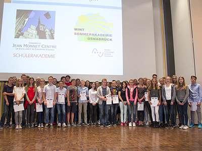 Mit einer feierlichen Übergabe der Zertifikate an die Schülerinnen und Schüler endeten am Donnerstagabend, 16. Juni 2016, offiziell die MINT-Sommerakademie des Schüler-Forschungs-Zentrums (SFZ) Osnabrück und die JMCE-Schülerakademie (Jean Monnet Centre of Excellence) in der Aula der Universität Osnabrück. In den vorhergehenden zwei Wochen haben insgesamt etwa 115 ausgewählte Schülerinnen und Schüler aus der Stadt und den Landkreis Osnabrück an den Akademien teilgenommen.