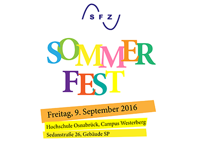 Bei herrlichem Sommerwetter fand am Freitag, 9.9.2016, das diesjährige Sommerfest des SFZ statt. Vor und im Gebäude SP der Hochschule Osnabrück, das der Bereich Robotics zum Training nutzen darf, präsentierten sich die einzelnen Bereiche des SFZ.