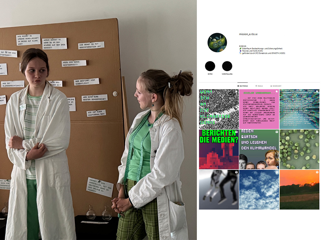 Osnabrück, 11. Juli 2025. Im Frühjahr 2025 entstand in Zusammenarbeit zwischen dem Projekt GROWTH der Hochschule Osnabrück und dem Schüler-Forschungs-Zentrum (SFZ) Osnabrück der wöchentlich stattfindende Theaterspielclub Klimakämpfer:innen für Schüler*innen. Ziel des Spielclubs war es, Jugendlichen einen kreativen Raum zu schaffen, in dem persönliche Bezüge zum Thema Klimawandel auf spielerisch-performative Weise dargestellt werden können. Mit der „Mission E.R.B.S.E.“ zeigte der Spielclub am 1. Juli final seine Ergebnisse in einer analogen Installation. Vorab visualisierten die Teilnehmerinnen die „Forschungsergebnisse“ in einem eigens eingerichteten Instagram-Kanal (@mission_e.r.b.s.e).
