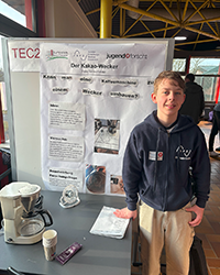 Ebenfalls im Fachbereich Technik und bei der Junior Sparte stellte Felix Brinkschröder sein Projekt zum Kakao-Wecker vor, bei dem er eine Kaffeemaschine mithilfe von einer Zeitschaltuhr und einem Ventilator zu einem Wecker umfunktionierte, der ihn mithilfe des Geruchs des verwendeten Kakaos wecken sollte.