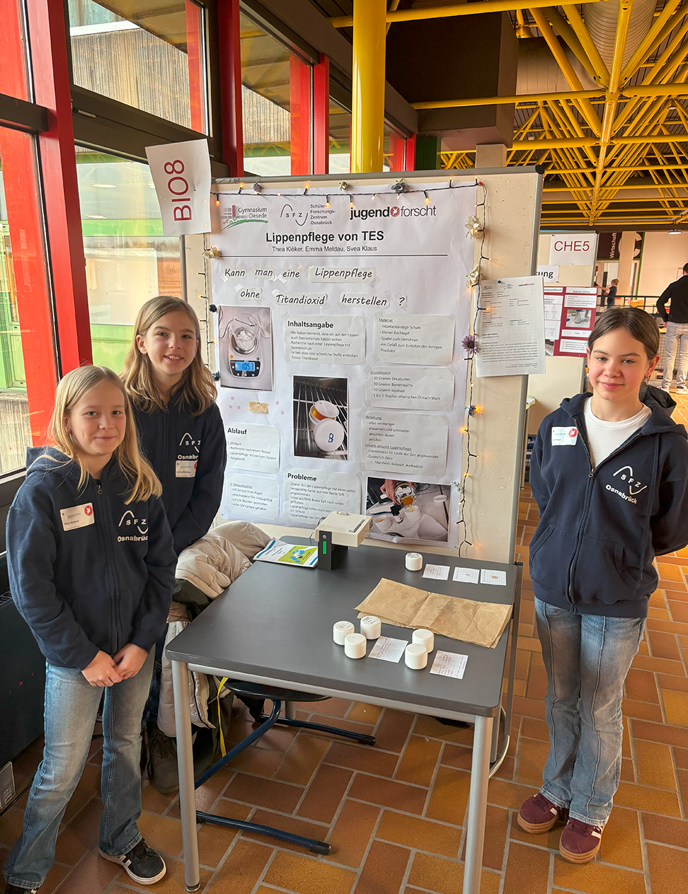 Auch im Fachbereich Biologie konnte ein Projekt einen dritten Platz gewinnen. Die Schülerinnen Thea Klöker, Emma Meldau und Svea Klaus konnten die Jury mit ihrem Projekt zur eigenständig hergestellten Lippenpflege mit UV-Schutz, aber ohne Titandioxid, überzeugen.
