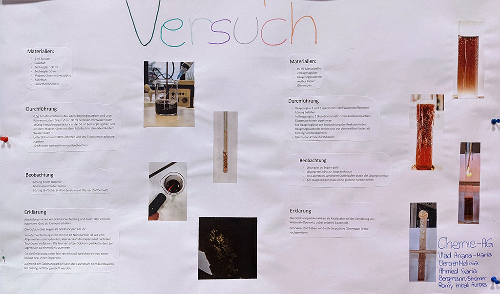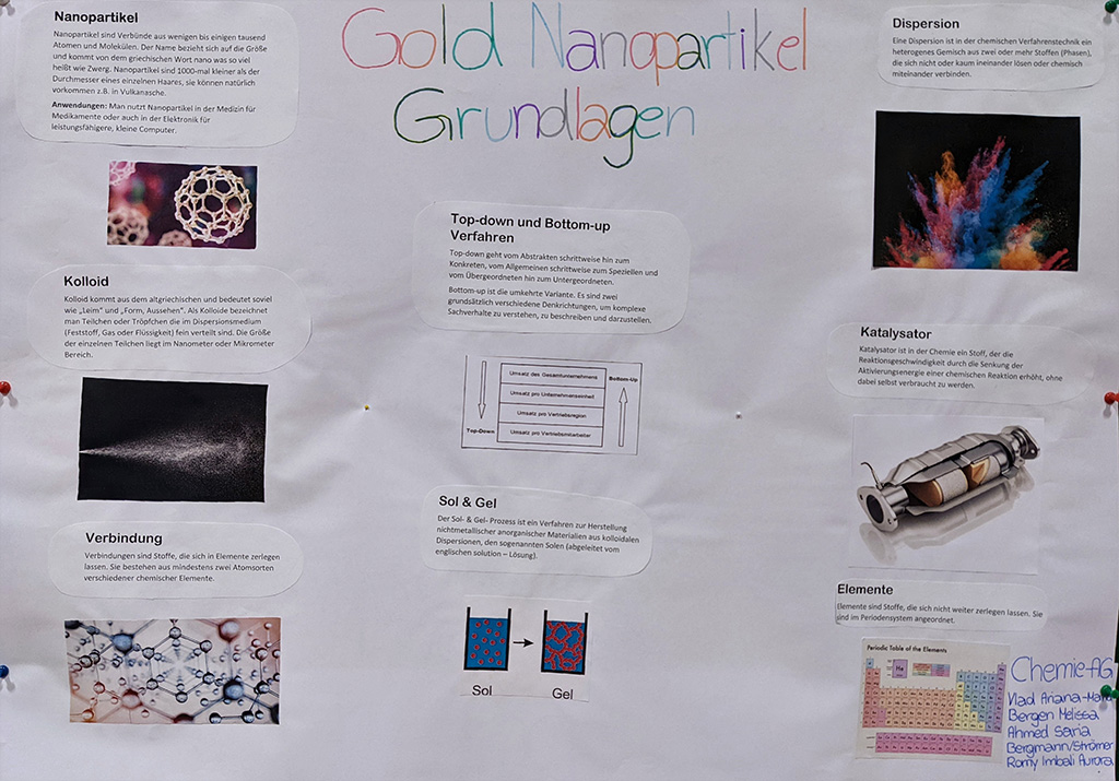 Nach den ersten Annäherungen in das Gebiet der Nanotechnologien zu Beginn des Schuljahres stand mit dem Projekt „Gold Nanopartikel“ die Herstellung und Untersuchung von Nanopartikeln an. Die Schülerinnen Ariana Vlad, Melissa Bergen, Saria Ahmed und Romy Bergmann führten dazu einen Versuch zur Synthese und einen Versuch zur katalytischen Wirkung der Partikel auf Wasserstoffperoxid durch, was in der Ausgestaltung von zwei Plakaten zu den fachlichen Grundlagen und den durchgeführten Versuchen gipfelte, die man hier begutachten kann.