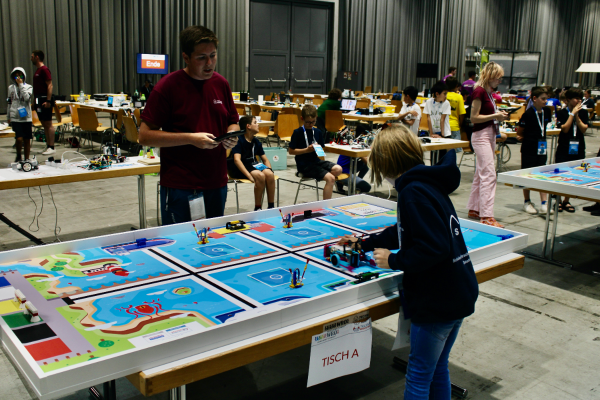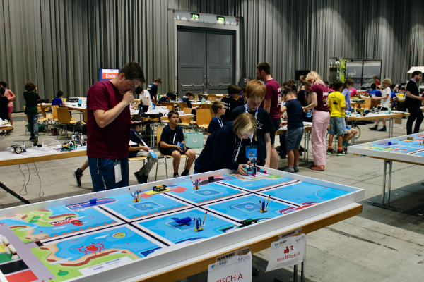 Am nächsten Morgen hieß es dann pünktlich anzutreten in der Messe Freiburg. Nach der Eröffnungszeremonie wurde es ernst für Team „Fire Soccer“, Henning Schulte-Südhoff und Jos Bühren, sowie für Team „blank“, Finn Pawellek und Ben Pieper. Während Fire Soccer in der Altersklasse Elementary und blank in der Altersklasse Junior, in die zweistündige Bauphase starteten, konnten sich die mitgereisten Fans über die anderen Wettbewerbskategorien informieren. In der Bauphase musste von den Teams der in Einzelteilen zerlegte Roboter zunächst wieder aufgebaut werden und in ersten Testrunden seine Funktionsfähigkeit beweisen. Auch musste das vorbereitete Programm noch an die örtlichen Gegebenheiten und die Überraschungsaufgabe angepasst werden.